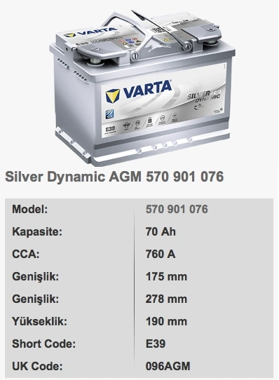12V-70 AH VARTA AGM STAR STOP AKÜ